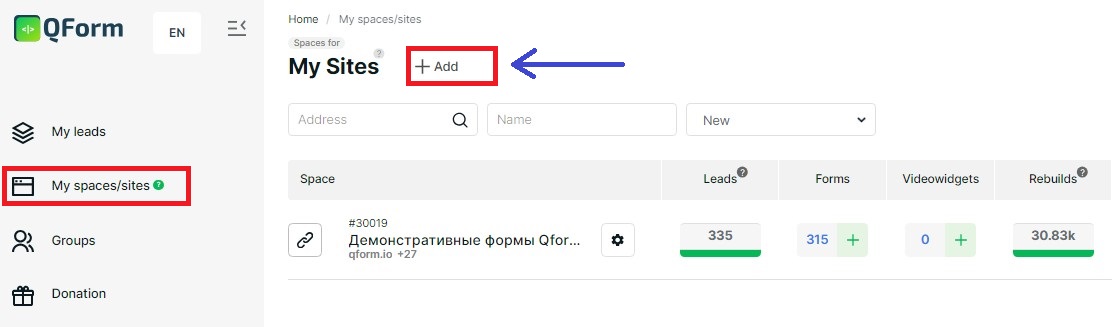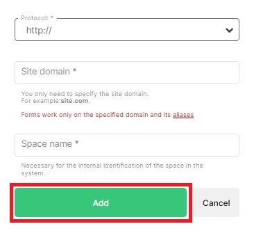 To start working with the service, you need to add the space of the site where the form will be installed.