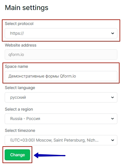 On the «Customize» tab of the space in the «Basic Settings» section, you can change basic information about the space, set the language for forms, region, and time zone.