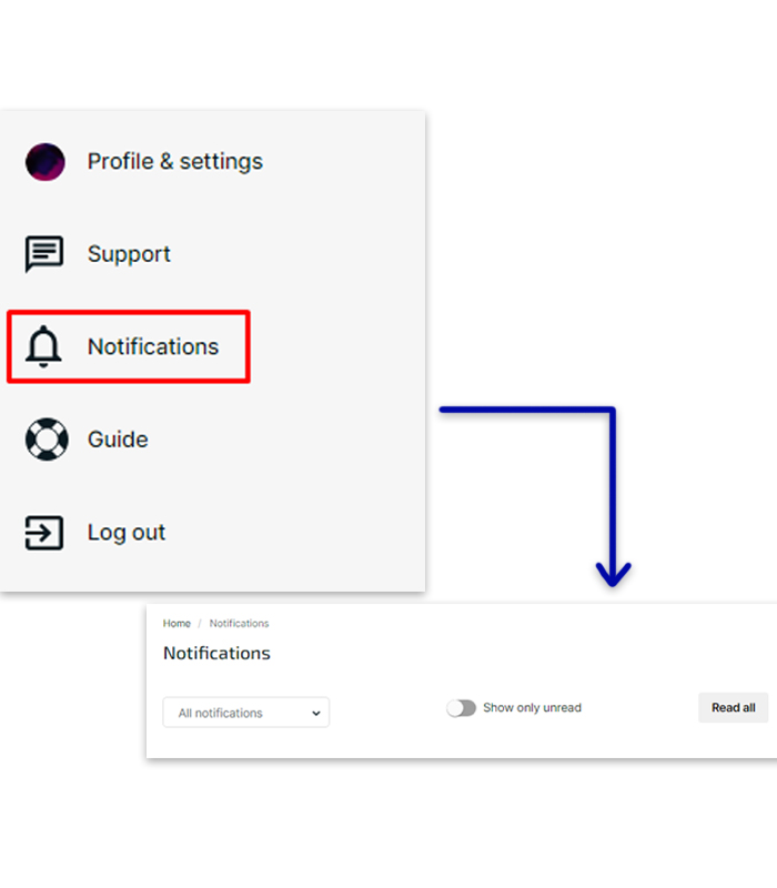 The application will be reviewed, and the «Notifications» section of the side menu will display a message about successful submission of the application.