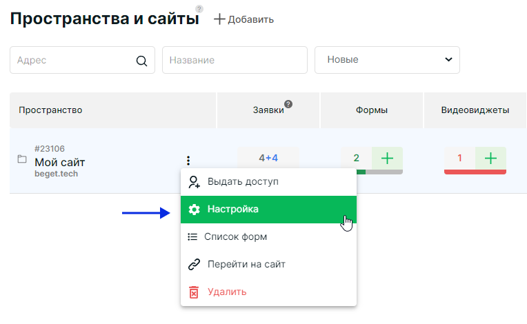 Перейдите на страницу «Пространства и сайты», нажмите значок «⠇» около нужного пространства и выберите «Настройка».
