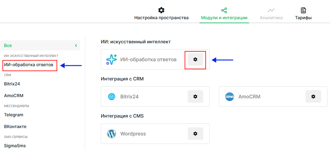 Перейдите во вкладку «Модули и интеграции» и выберите раздел «ИИ-обработка ответов» или нажмите значок шестеренки в соответствующем блоке в центральной части группы интеграции.