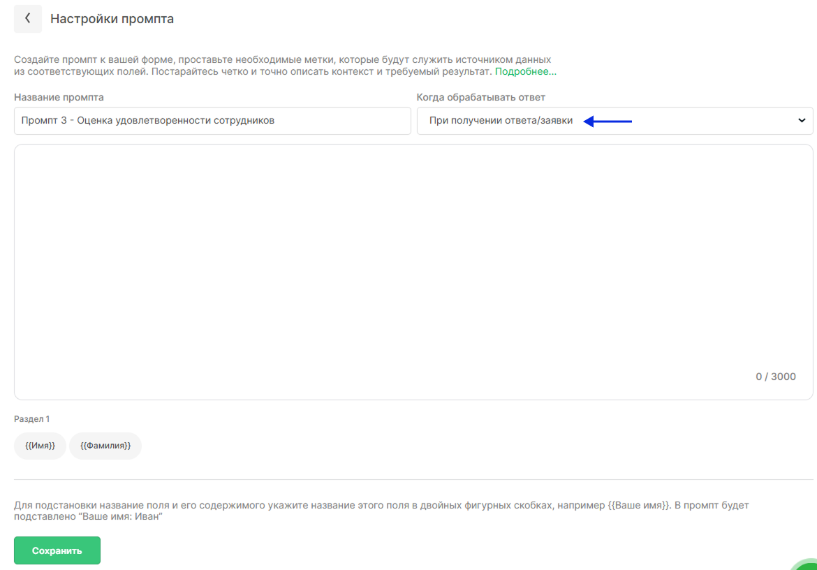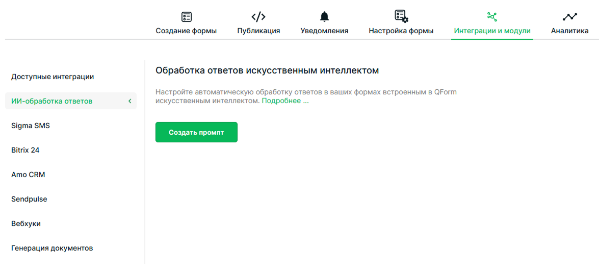 - Откройте настройки формы → вкладка «Интеграции и модули» → «ИИ-обработка ответов» → «Создать промпт».