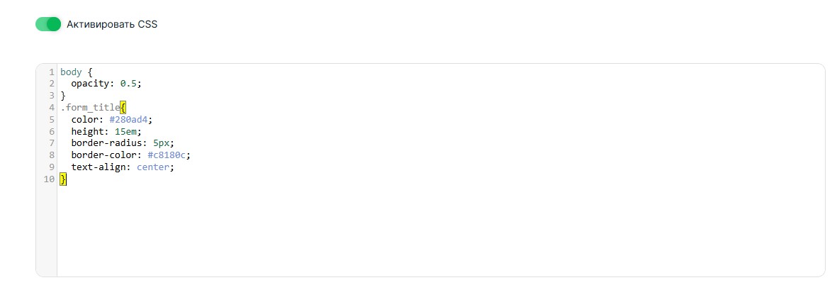 - Поле ввода CSS-кода с подсветкой синтаксиса, отступами и переносом строк.